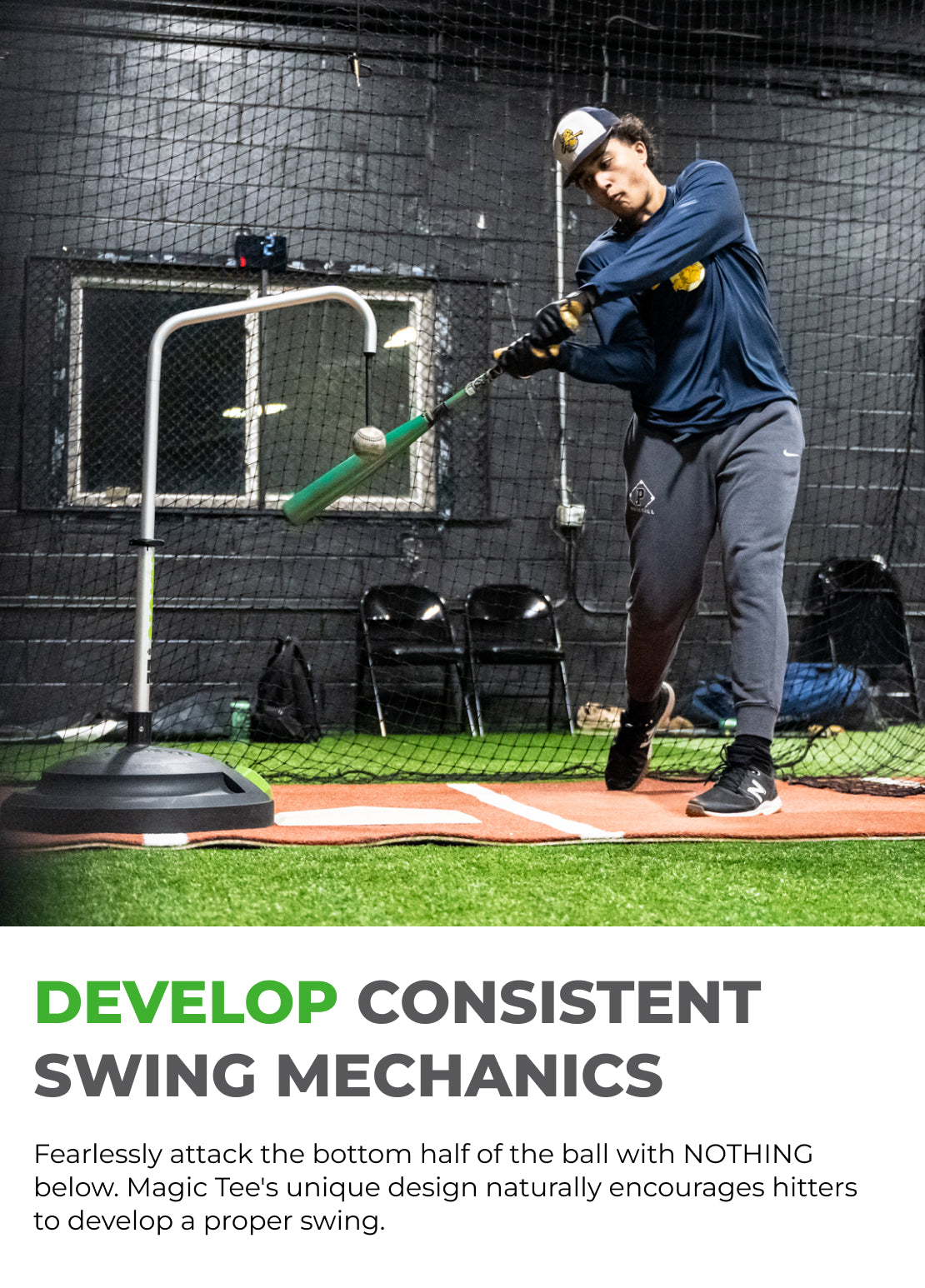 Magic Touch: Our patented tee design hangs the ball with vacuum suction, removing all obstructions from lower support.
